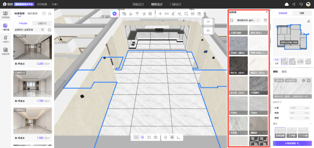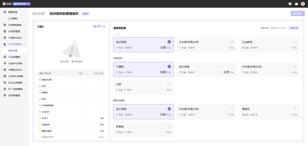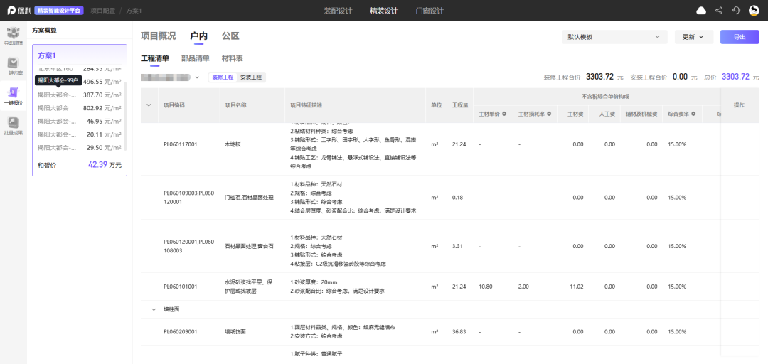 基于深化设计方案,根据各区域的客户需求,实现产品的快速调整,对材料选品进行实时优化创新;一键更新报价,实现对“集采选品”的动态管控。
