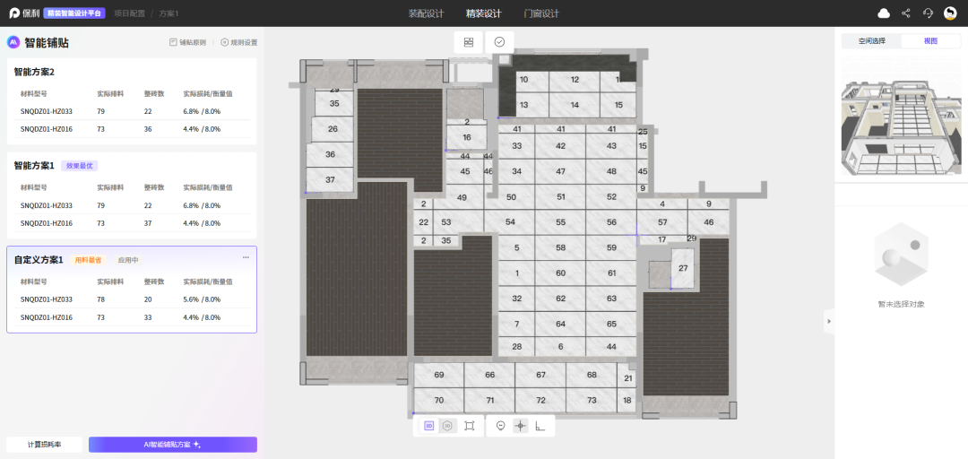 通过超高算力进行比选优化,寻求设计最优解,如:智能生成多种瓷砖铺贴方案,推荐成本最优的设计成果。